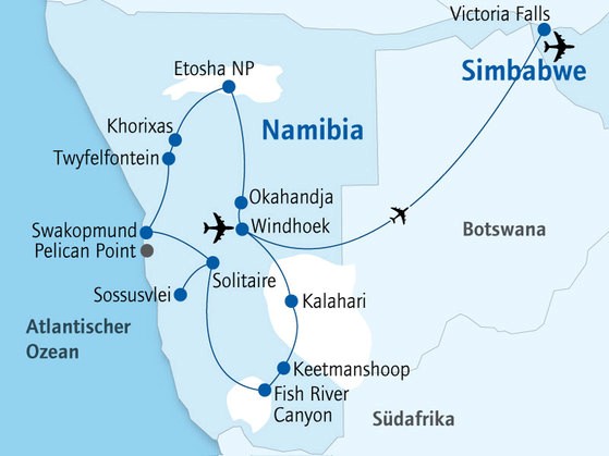 Windhoek Okahandja Etosha Nationalpark KhorixasVingerklip TwyfelfonteinSwakopmund Walvis Bay Kuisep Canyon Solitaire Sossusvlei Düne 49 Dead Vlei Sesriem Canyon Kap Bartolomeu Diaz Lüderitz Kolmanskop Wildpferde Fish River Canyon Keetmanshoop, Köcherbaumwald Steppe der Kalahari Maun (Botswana)Victoriafälle (Simbabwe)Windhoek